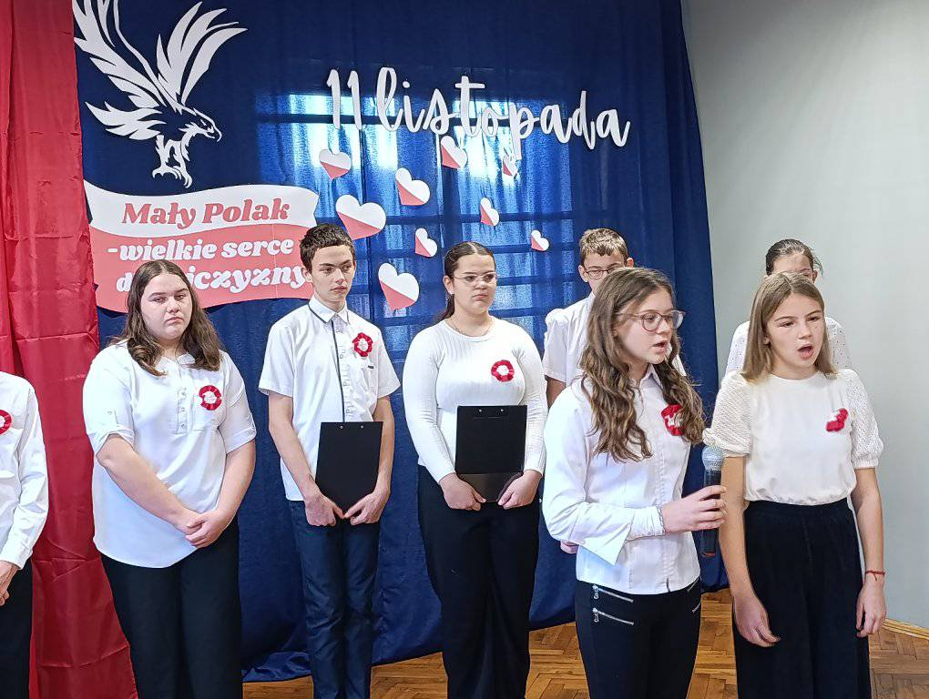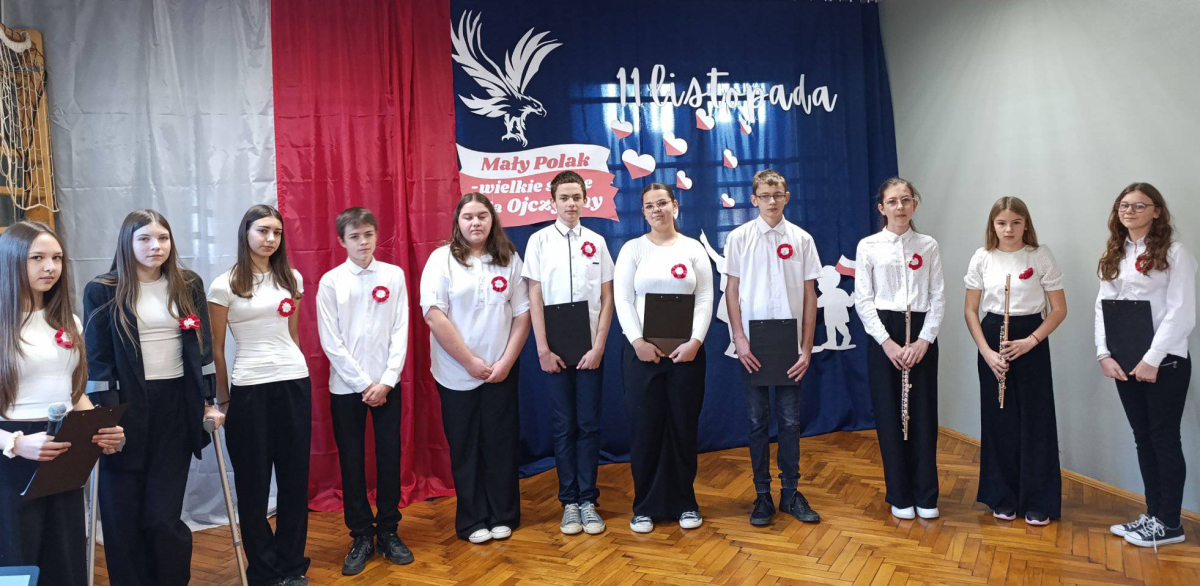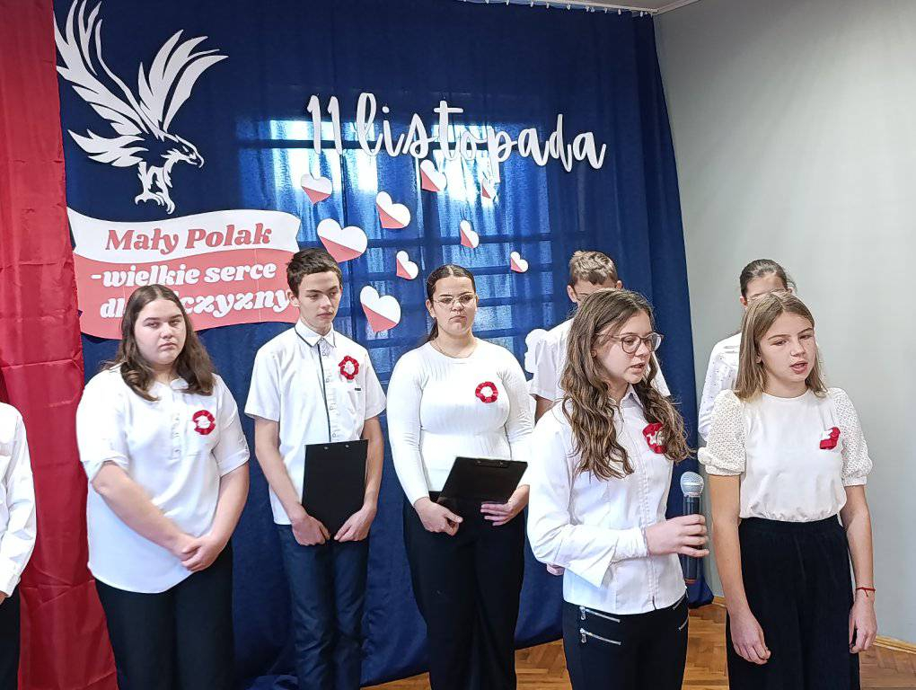 Akademię przygotowali uczniowie klasy ósmej pod opieką swojej wychowawczyni. Występ miał formę montażu słowno-muzycznego, w którym ósmoklasiści zaprezentowali pełne refleksji wiersze i teksty historyczne obrazujące drogę Polski do niepodległości.
