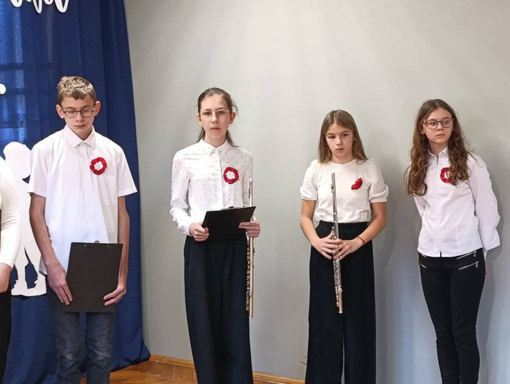 Ważnym elementem uroczystości była również oprawa muzyczna. Podczas akademii swoje umiejętności zaprezentowały uczennice z klasy szóstej, uczniowie z klasy pierwszej i drugiej oraz dzieci z oddziału przedszkolnego wykonując pieśni patriotyczne. Ich występy nadały wydarzeniu podniosłego charakteru i wzruszyły zgromadzoną publiczność.