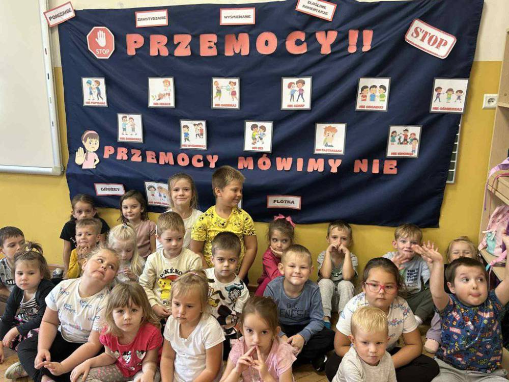 Dziś nasze przedszkolaki aktywnie dołączyły do szkolnej akcji przeciwdziałania przemocy rówieśniczej. To ważne wydarzenie, które odbywa się również w całej naszej szkole, miało na celu budowanie postaw szacunku, empatii i koleżeństwa już od najmłodszych lat.