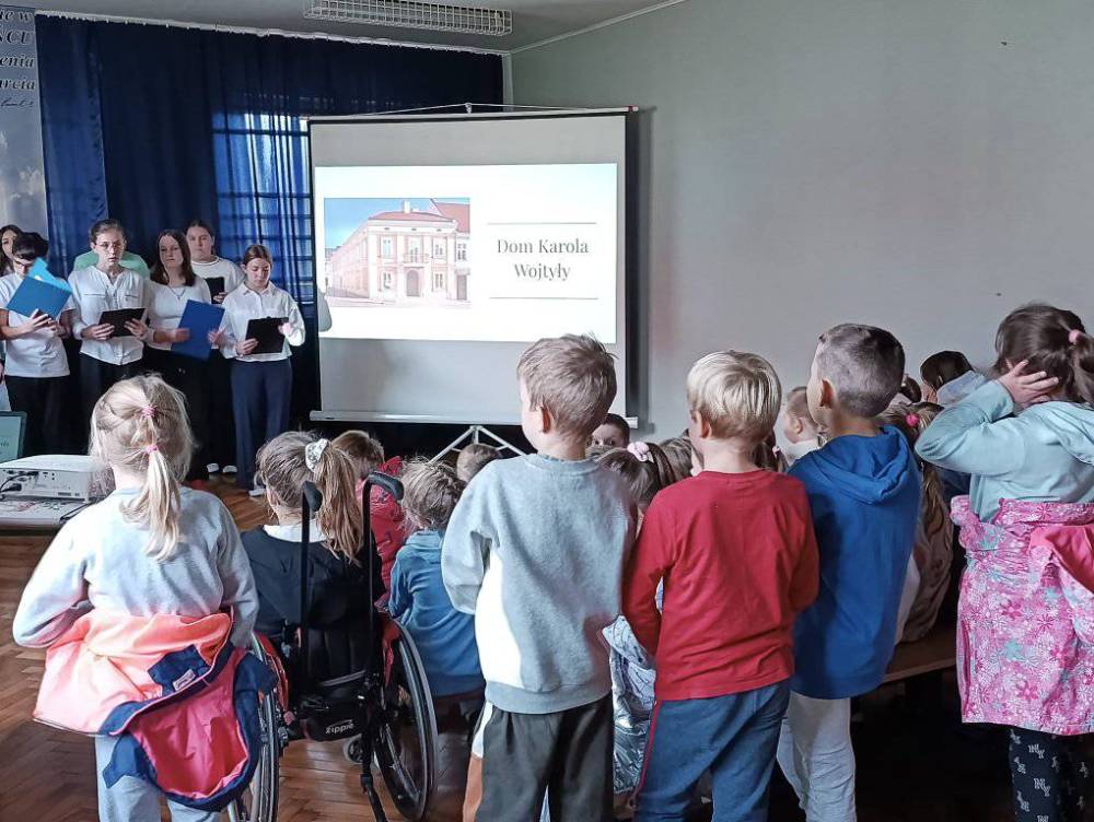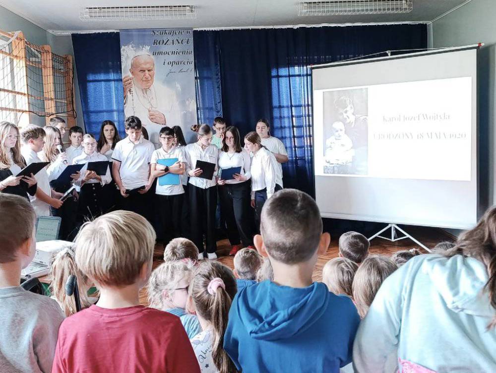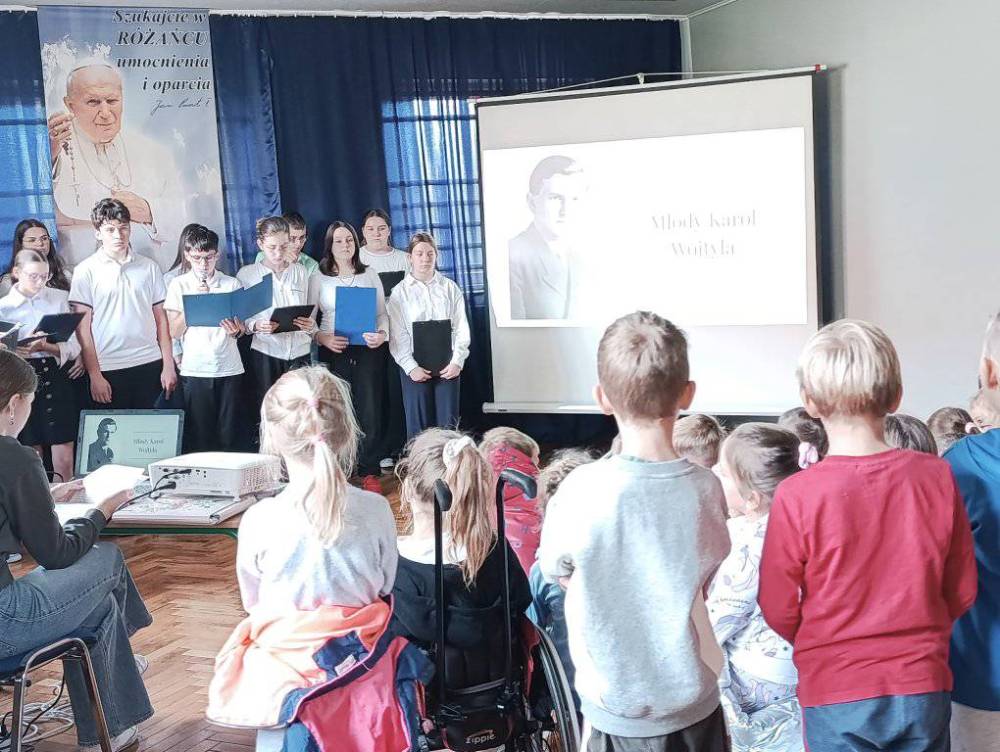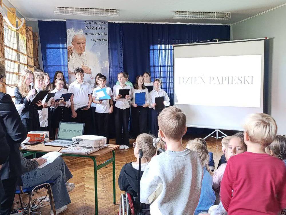 W dniu 22 października 2025 nasza społeczność szkolna przeżywała Dzień Papieski. Uczniowie klas VII i VIII podczas akademii przybliżyli nam postać św. Jana Pawła II. W czasie wystąpienia przenieśli nas w stan zadumy i refleksji. Zwieńczeniem była pieśń "Barka", którą lubił śpiewać św. Jan Paweł II, a dziś jest ulubioną pieśnią dzieci i młodzieży.