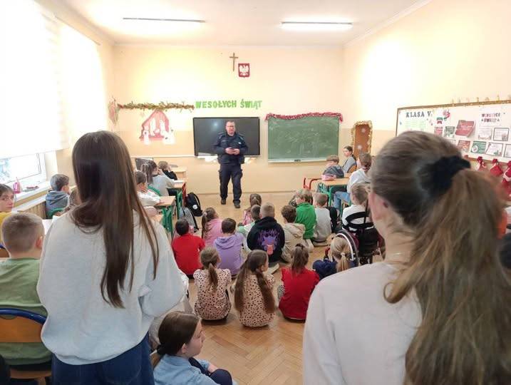 Uczniowie dowiedzieli się także, jak bezpiecznie poruszać się po drogach zimą oraz jak zachować się w kontaktach z nieznajomymi. Pan Piotr Witek przypomniał numery alarmowe oraz zasady wzywania pomocy w sytuacjach zagrożenia. Spotkanie miało charakter pogadanki, podczas której uczniowie mogli zadawać pytania i dzielić się własnymi doświadczeniami.