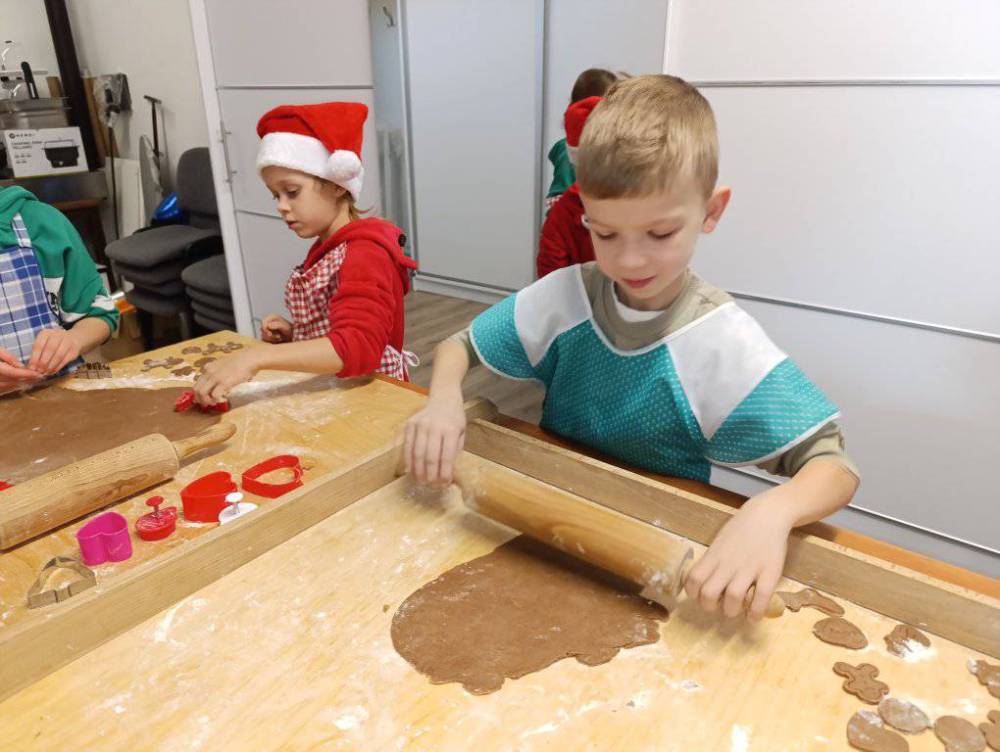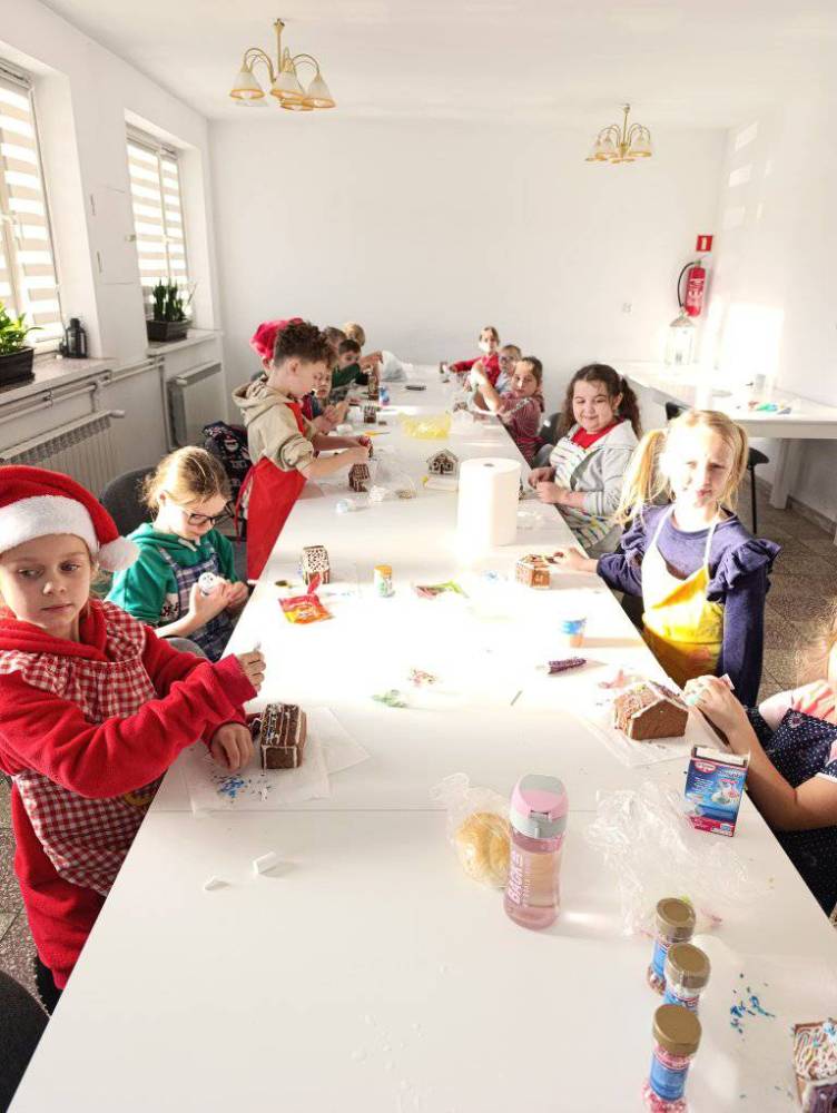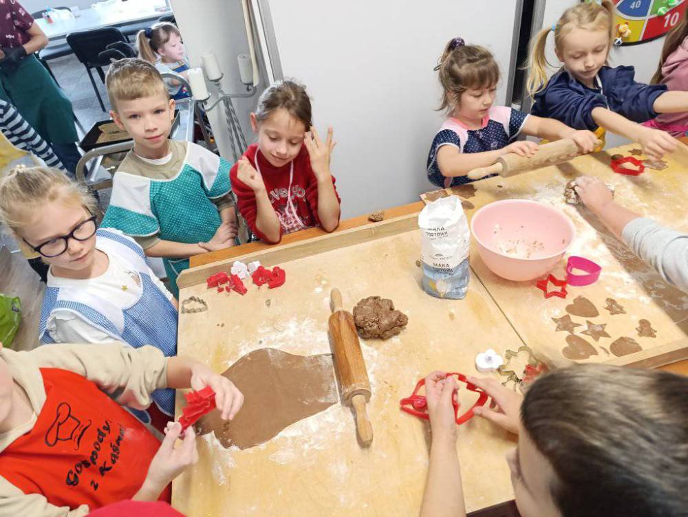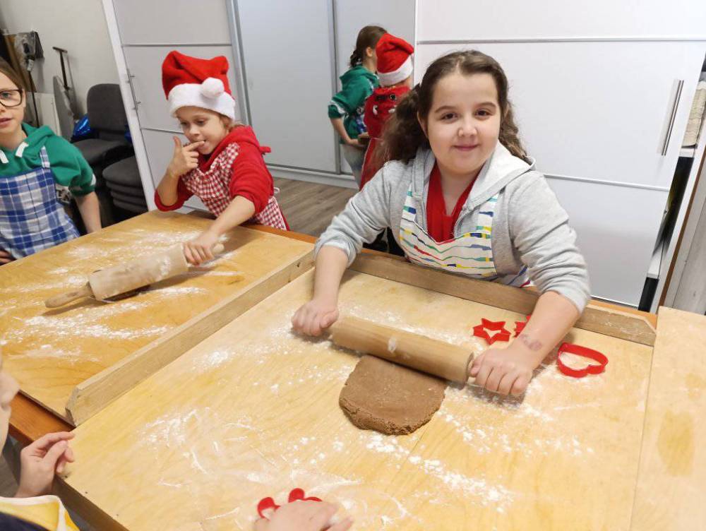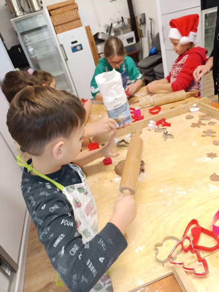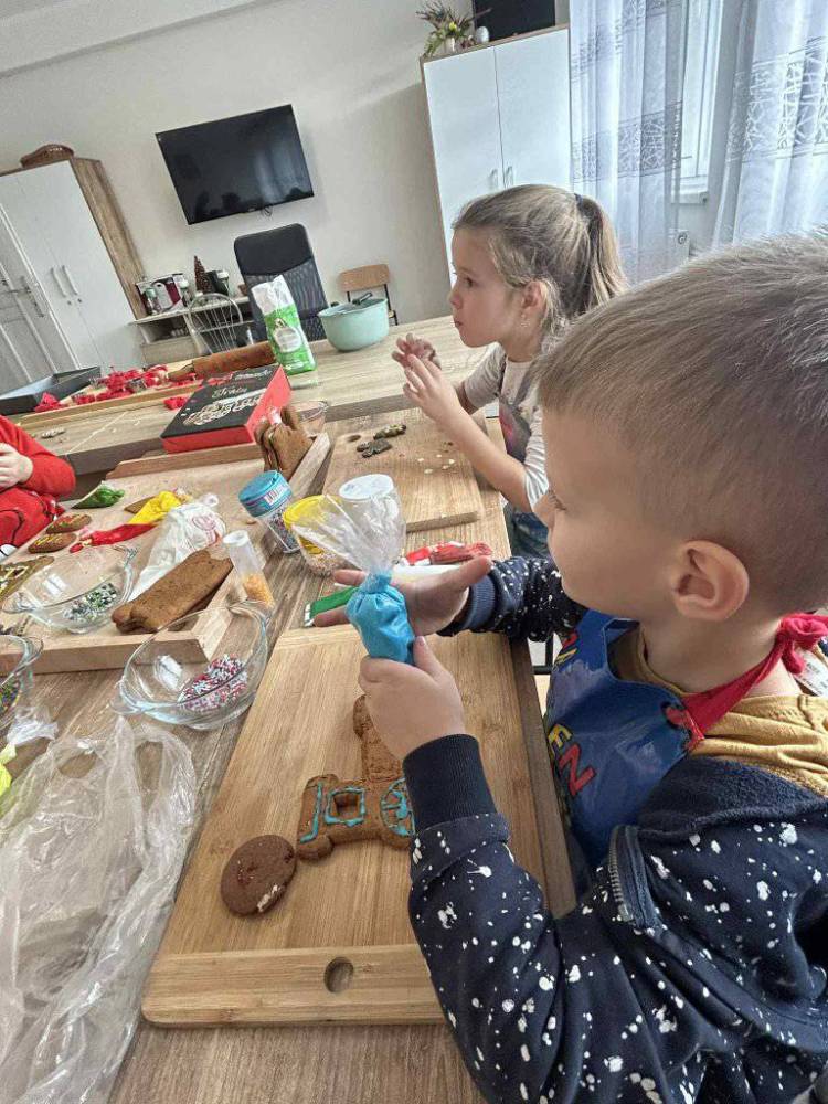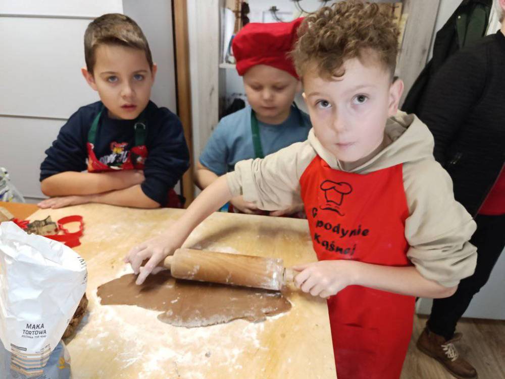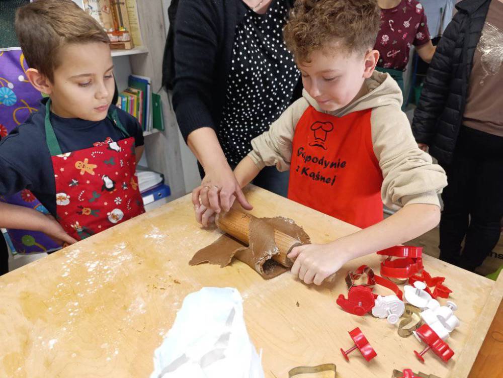 Podczas wizyty dzieci, przy współpracy Rodziców oraz Pań z Kół Gospodyń Wiejskich z Kąśnej Dolnej i Kąśnej Górnej, aktywnie uczestniczyły w przygotowywaniu świątecznych wypieków. Z dużym zaangażowaniem piekły i ozdabiały pierniczki, dekorowały domki z piernika, a także piekły drożdżowe choinki. Zajęcia sprawiły dzieciom wiele radości, rozwijały ich zdolności manualne oraz kreatywność, a także pozwoliły poznać tradycyjne receptury i zwyczaje.