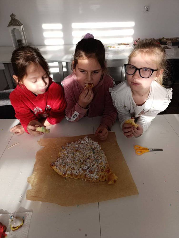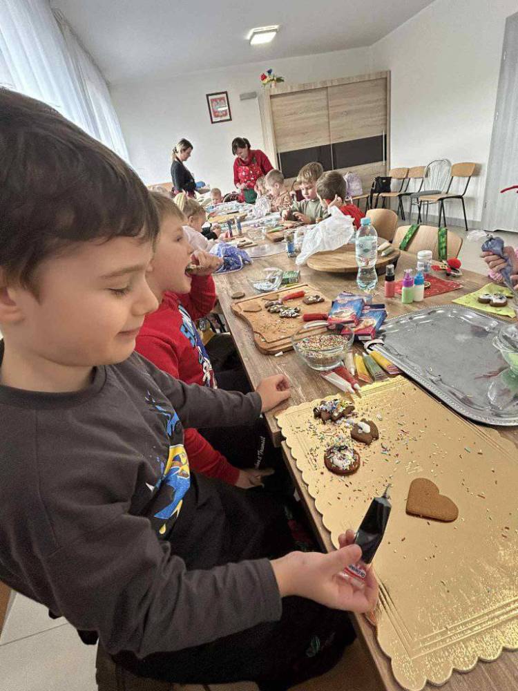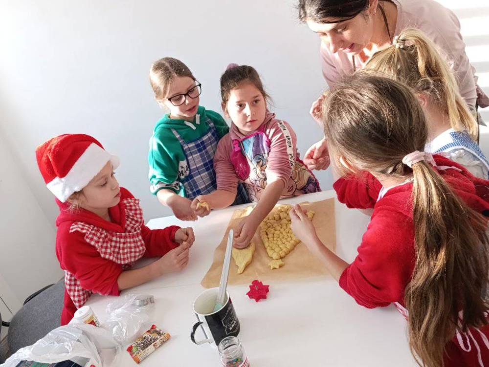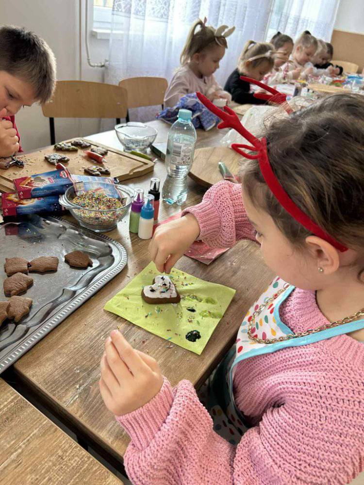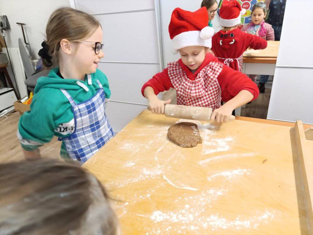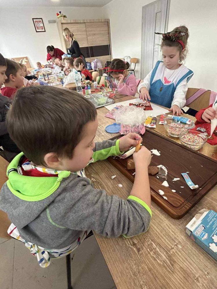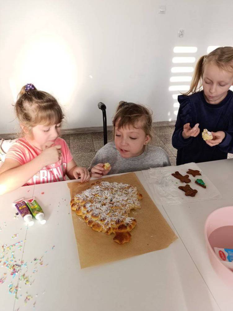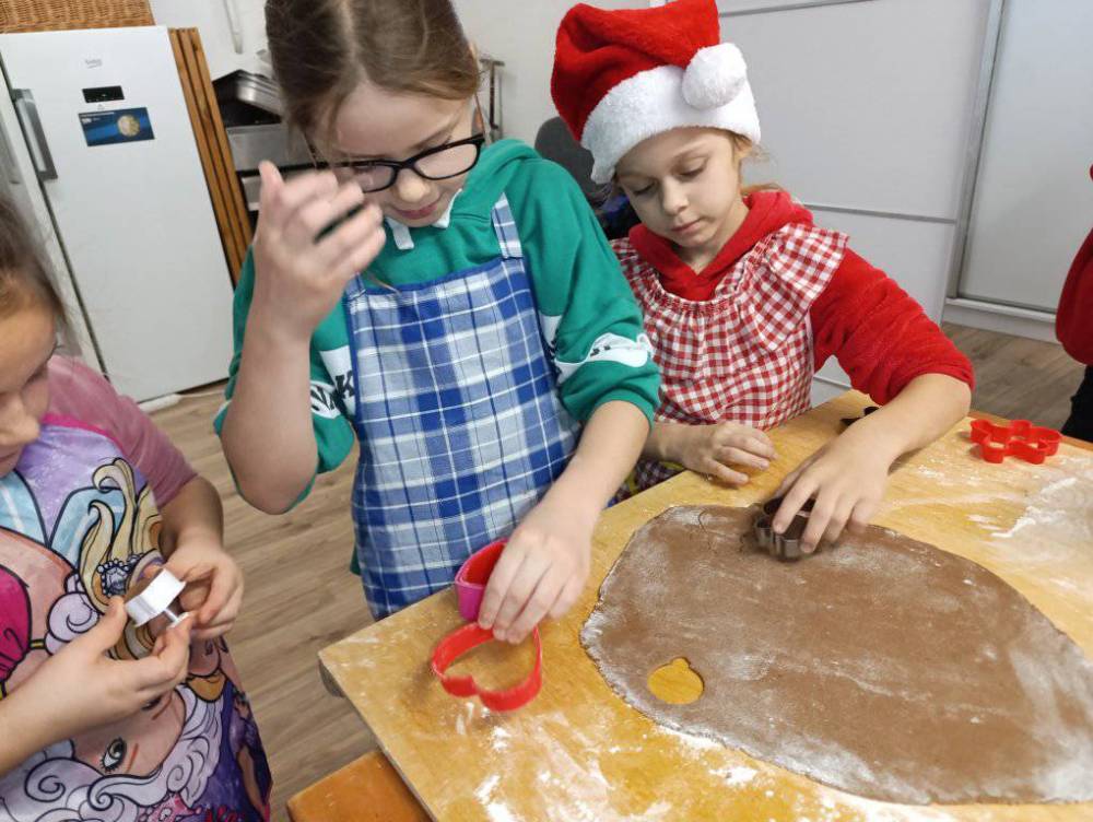 Podczas wizyty dzieci, przy współpracy Rodziców oraz Pań z Kół Gospodyń Wiejskich z Kąśnej Dolnej i Kąśnej Górnej, aktywnie uczestniczyły w przygotowywaniu świątecznych wypieków. Z dużym zaangażowaniem piekły i ozdabiały pierniczki, dekorowały domki z piernika, a także piekły drożdżowe choinki. Zajęcia sprawiły dzieciom wiele radości, rozwijały ich zdolności manualne oraz kreatywność, a także pozwoliły poznać tradycyjne receptury i zwyczaje.