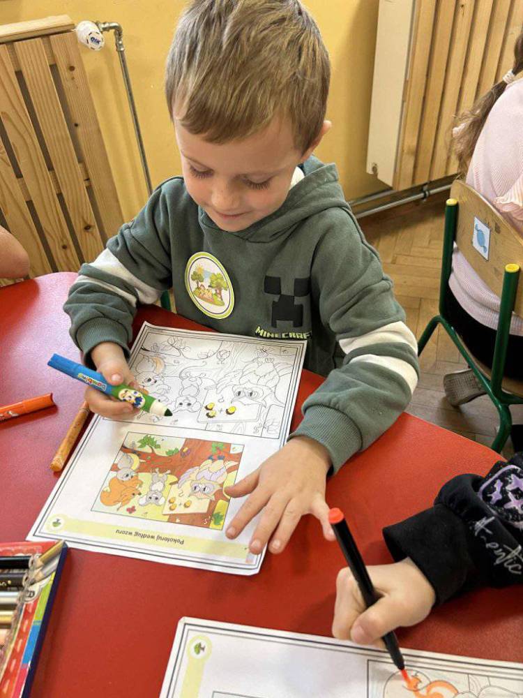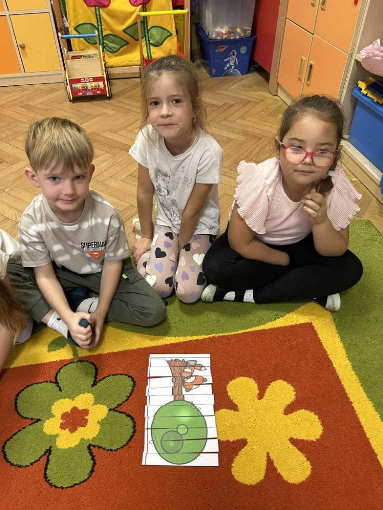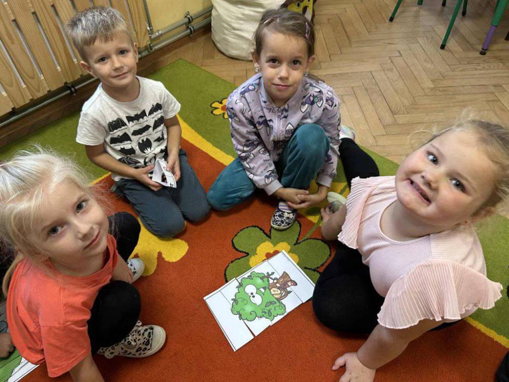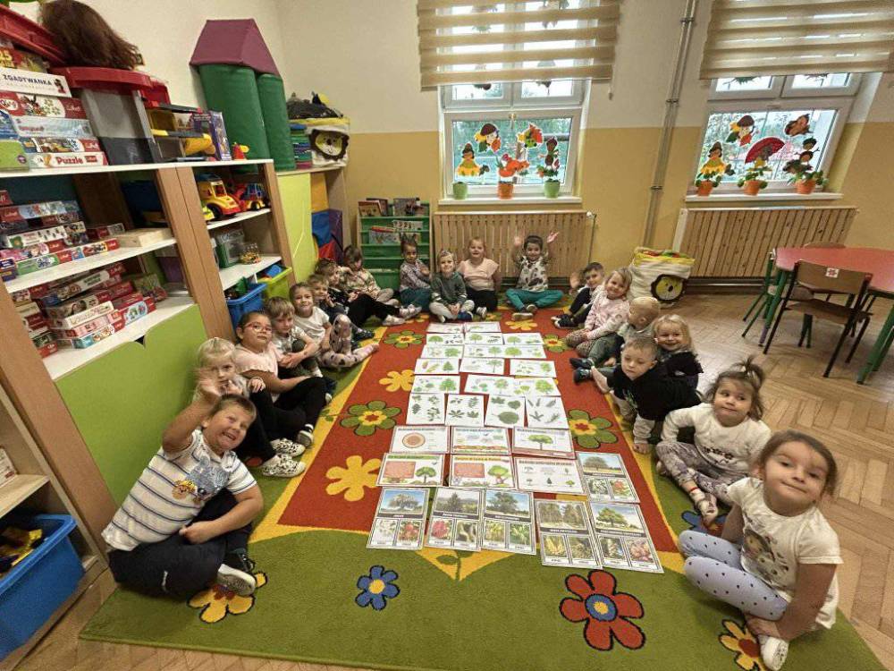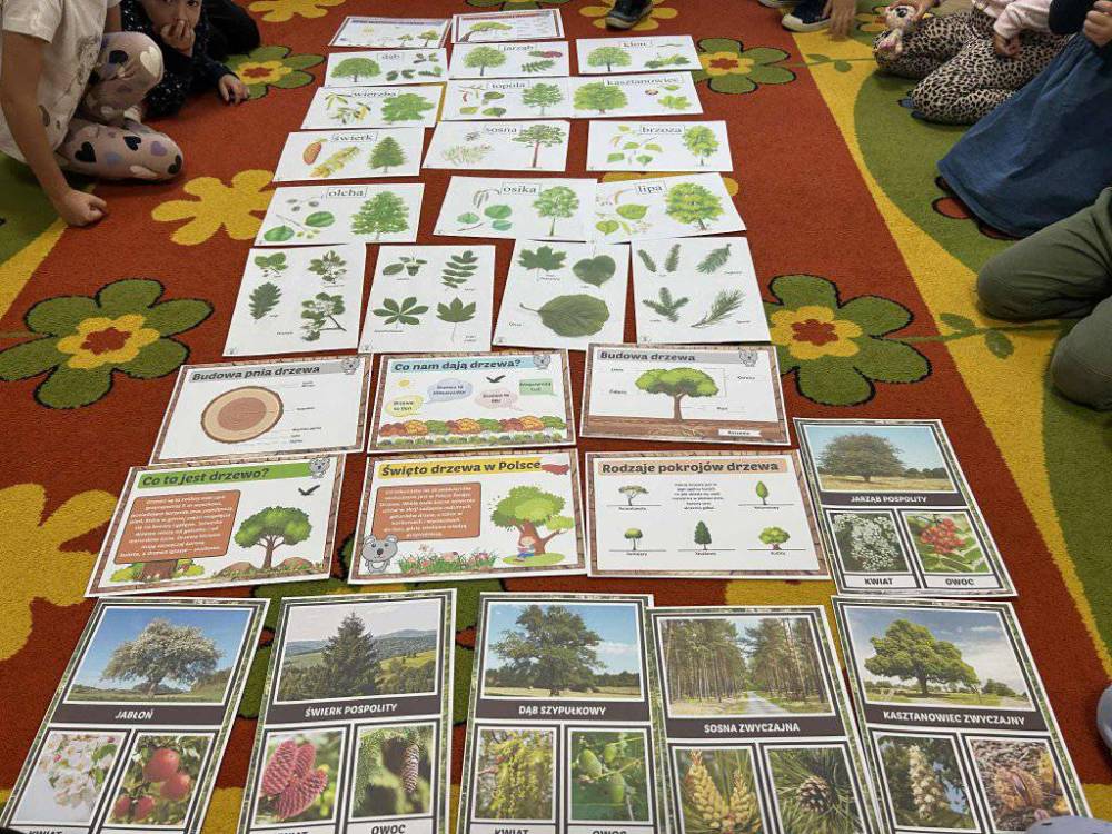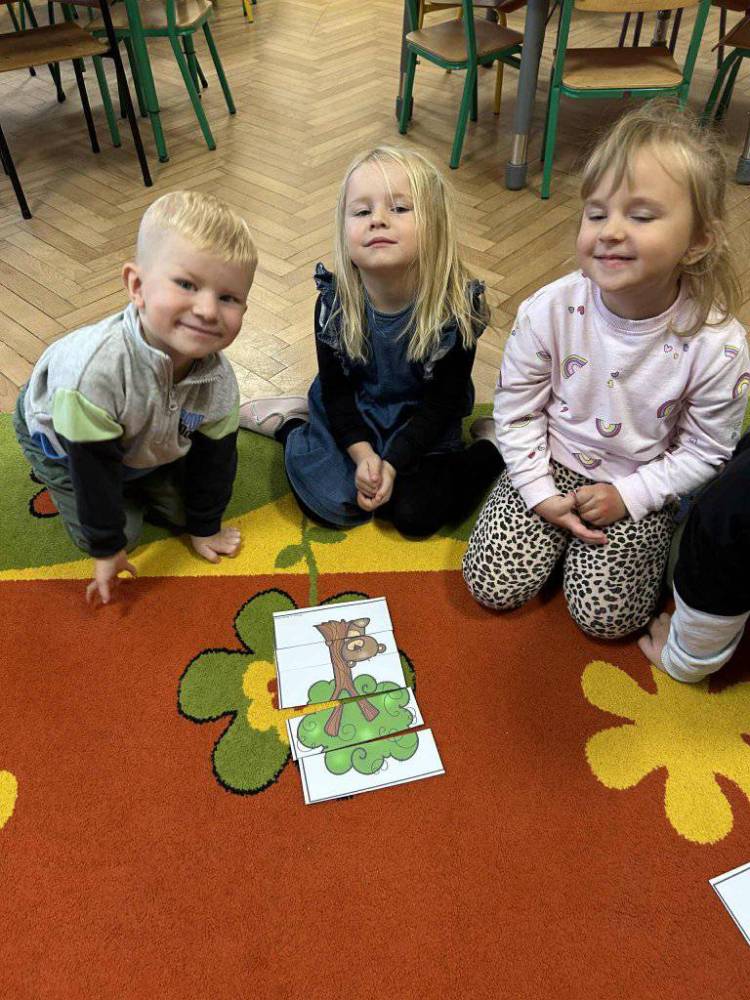 Przedszkolaki z zainteresowaniem słuchały opowieści o tym, jak rosną drzewa, dlaczego dają nam tlen i cień, a także jak możemy o nie dbać. Podczas zajęć dzieci rozpoznawały liście i owoce drzew, układały leśne puzzle oraz wykonywały prace plastyczne.
